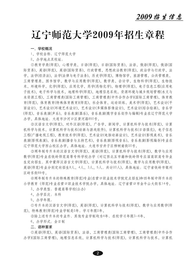 辽宁师范大学2009年招生章程