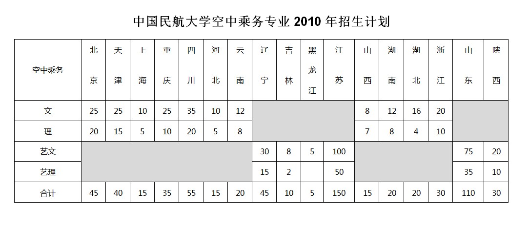 中国民航大学空中乘务专业2010年招生计划