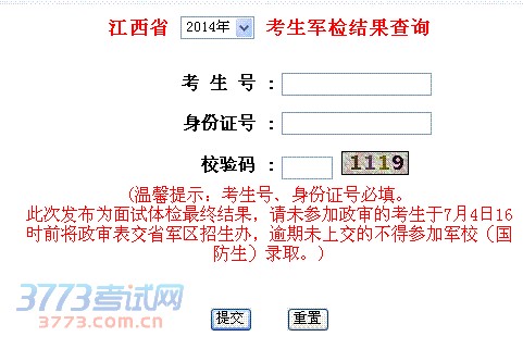 江西省 2014年 考生军检结果查询 考 生 号 : 身份证号 : 校验码 : (温馨提示:考生号、身份证号必填。此次发布为面试体检最终结果,请未参加政审的考生于7月4日16时前将政审表交省军区招生办,逾期未上交的不得参加军校(国防生)录取。)