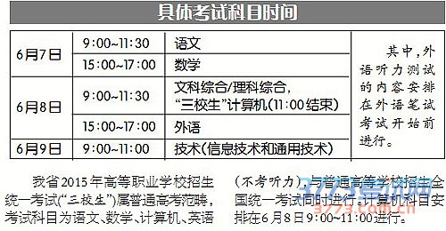 我省2015年高等职业学校招生统一考试(“三校生”)属普通高考范畴,考试科目为语文、数学、计算机、英语(不考听力),与普通高等学校招生全国统一考试同时进行。计算机科目安排在6月8日9∶00~11∶00进行。