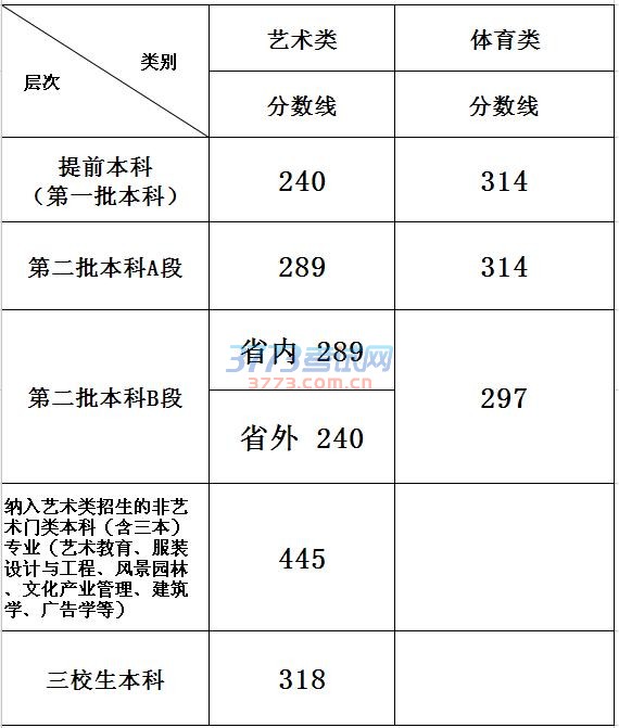 江西省2016年普通高校招生艺术、体育类文化录取控制分数线划线表