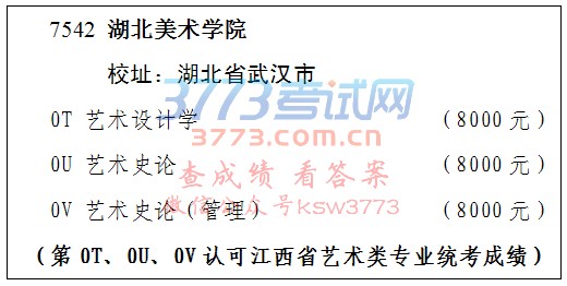 二、《高中生之友高考天地》2017年招生计划增刊上册(本科)第251页“7542湖北美术学院”所列最后一个专业下面的备注“第0T、0U、0B专业认可江西省艺术类专业统考成绩”更正为:“第0T、0U、0V认可江西省艺术类专业统考成绩”,0B(动画[影像媒体艺术])专业与其他校考专业一样使用校考成绩。更正后信息为: