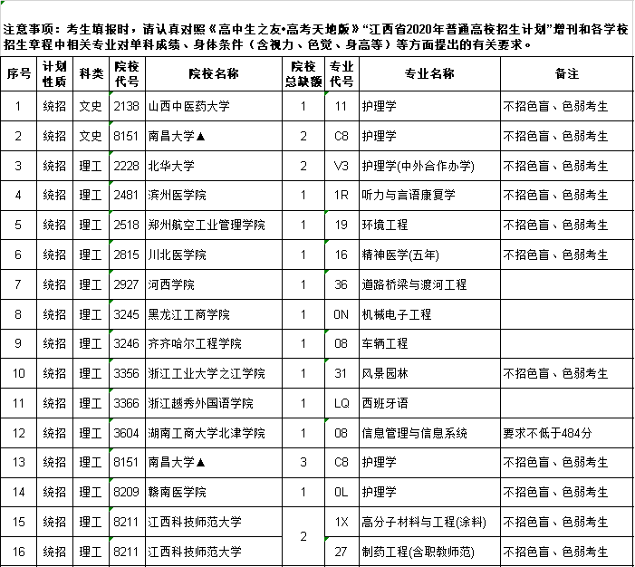 2020江西二本缺额院校及专业统计表(第二次征集)