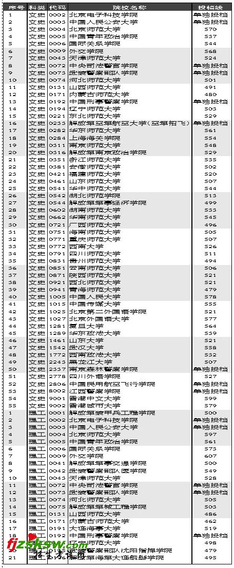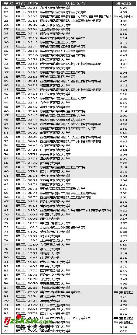 江西省2010年提前本科(国防)一志愿投档情况统计表