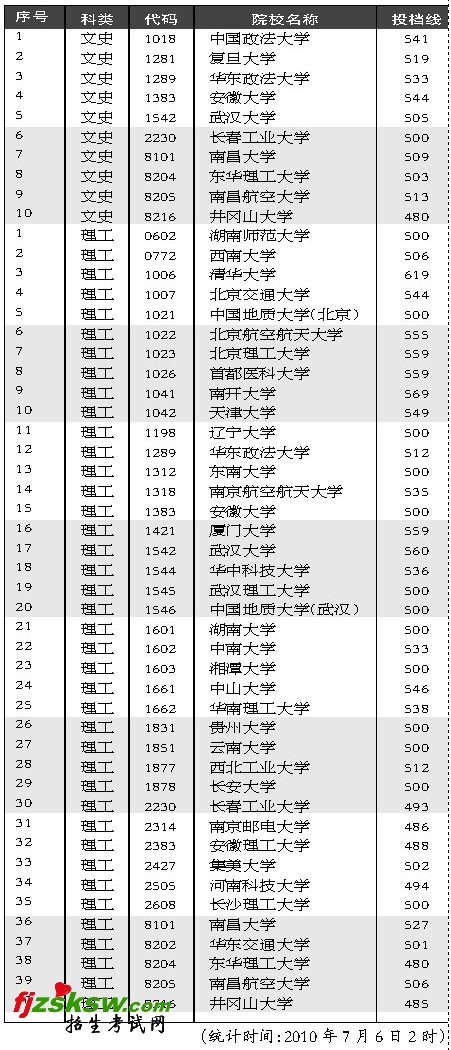 江西省2010年普通高校招生录取首场新闻发布会在江西师大瑶湖校区录取现场召开,并公布了提前批本科投档分数线。今年香港中文大学的文、理科投档线继续居首,文科为599分,理科为643分。一志愿投档后,文史九成、理工八成院校满额,未满额的院校在今日进行二志愿投档。