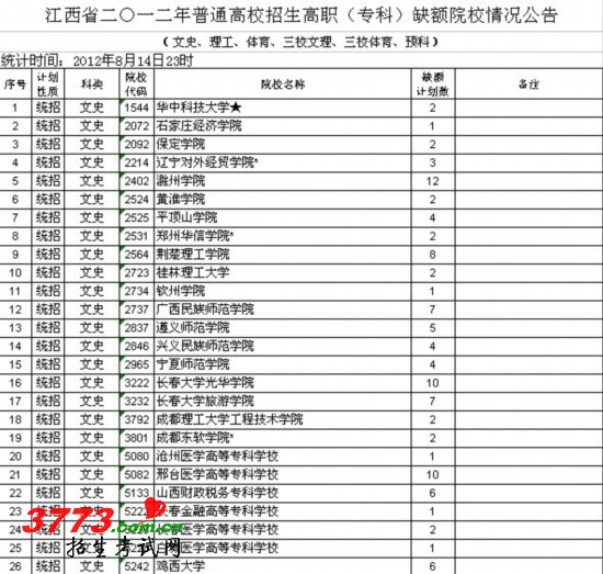 大江网讯 记者朱正、实习生王琼报道:8月15日,大江网记者从2012年高招录取现场获悉,2012年高职(专科)院校缺额情况已于今日凌晨公布(具体缺额情况见附件)。据统计,高职专科(包括文史、理工、体育、三校文理、三校体育、预科)总缺额33220人,属所有批次中缺额数量最多的批次。今日8时至18时考生均可进行网上征集志愿。