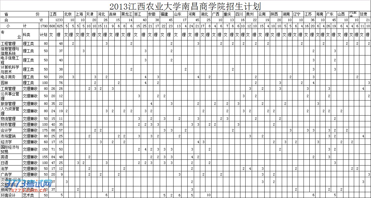 2013年江西农业大学南昌商学院分省分专业招生计划