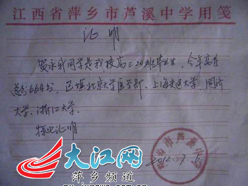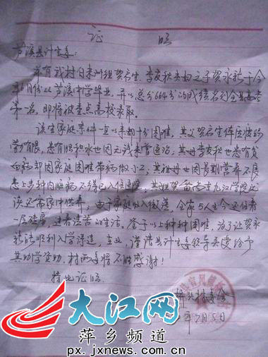 “去年,我考了611分,被天津大学录取,但因爸爸查出脑积水,动完手术后学费就没了。今年,我考了664分,第一志愿是8年制北大医学部,第二志愿是上海交大,可是老奶奶又因胃出血、胃溃疡、肾积水在芦溪县医院,我家本来就是低保户,出现这样的事,恐怕我又与大学无缘。”贺永新强忍着难过,跟记者诉说着家中的困难和他的担忧。
