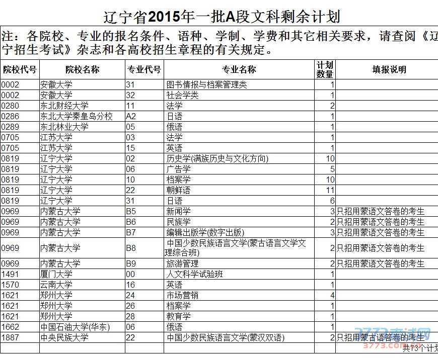 2015年辽宁省普通高校招生录取本科第一批A段文科剩余计划查询(点击放大查看)