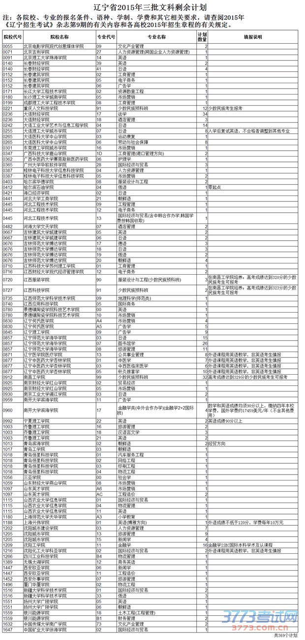 2015年辽宁省普通高校招生录取本科第三批文科第一次剩余计划(点击放大查看)