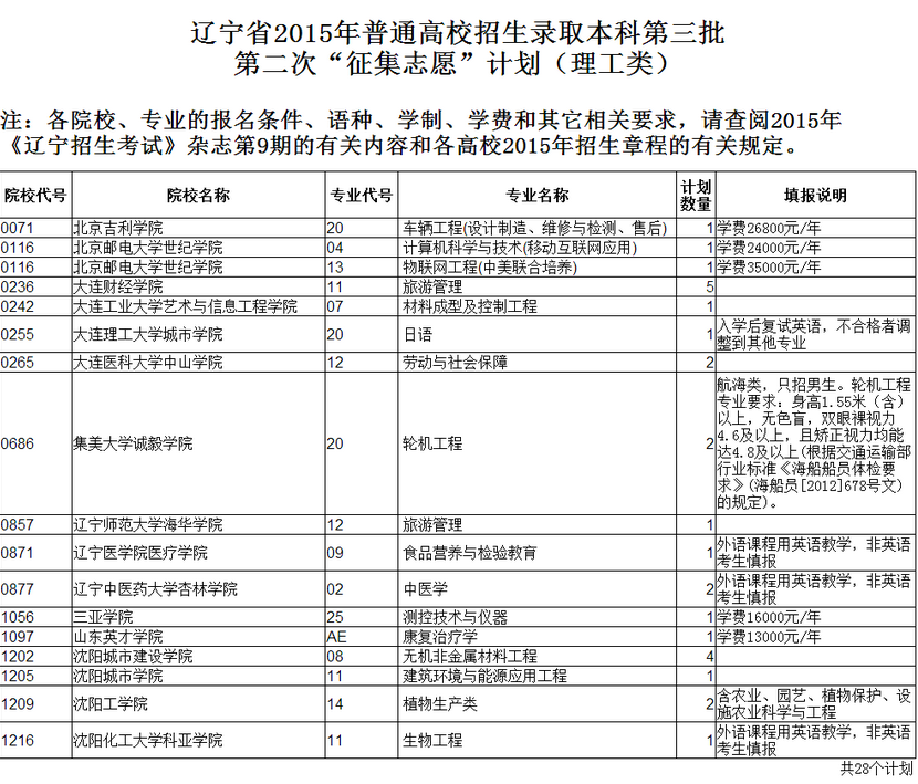 2015年辽宁省普通高校招生录取本科第三批理工类第二次“征集志愿”计划(点击放大查看)