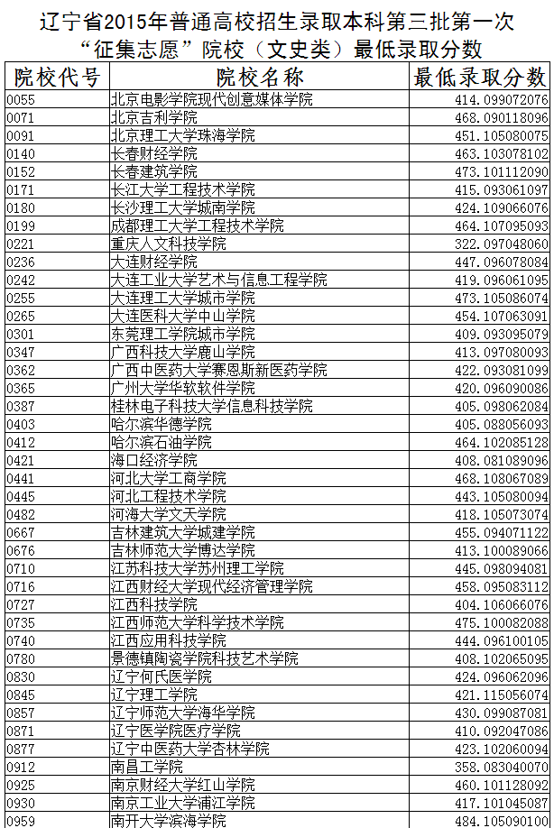2015辽宁高考三本征集志愿录取分数线(文科)