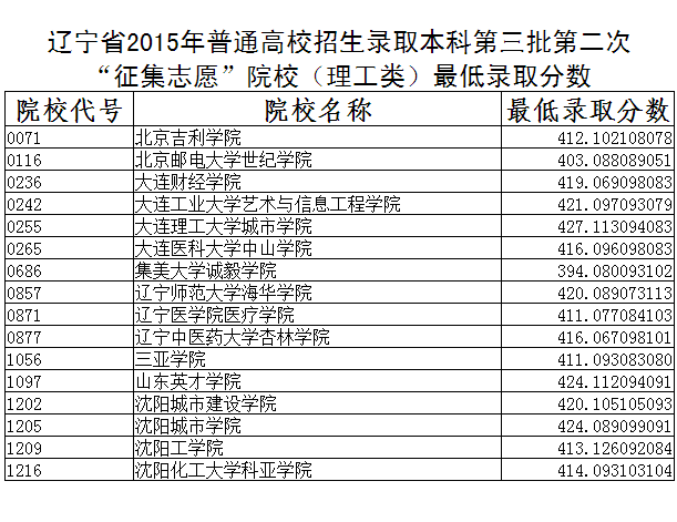 2015辽宁高考三本征集志愿录取分数线(理科)