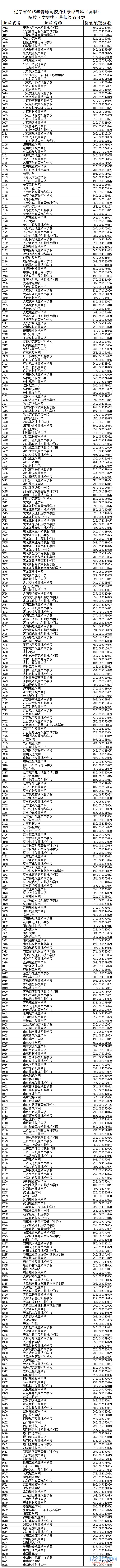 辽宁省2015年普通高校招生录取专科(高职)院校(文史类)最低录取分数 (点击放大查看)