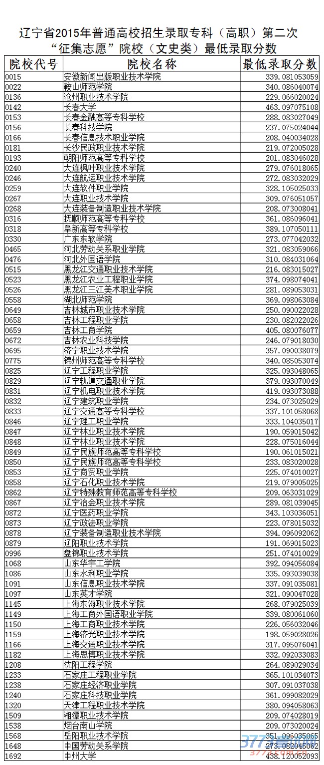 辽宁省2015年普通高校招生录取专科(高职)第二次“征集志愿”院校(文史类)最低录取分数(点击放大查看)