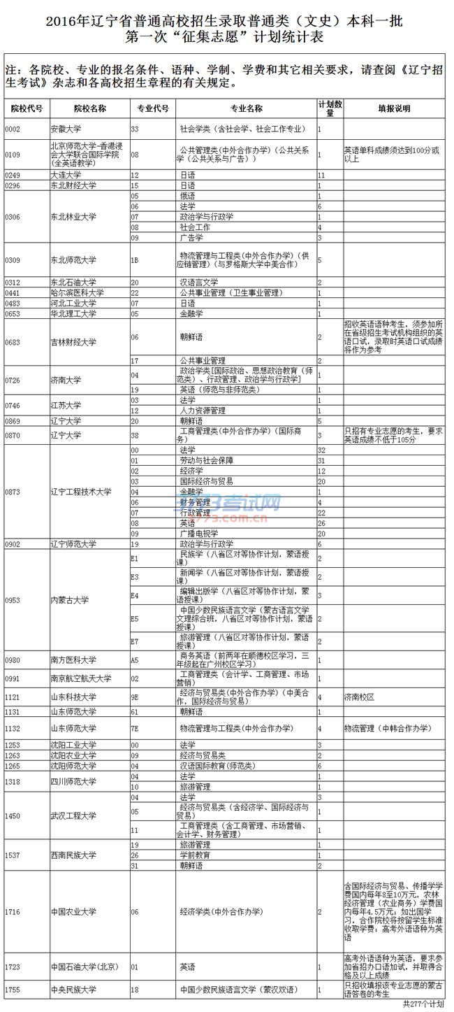 2016辽宁高考一本文科征集志愿计划专业统计表
