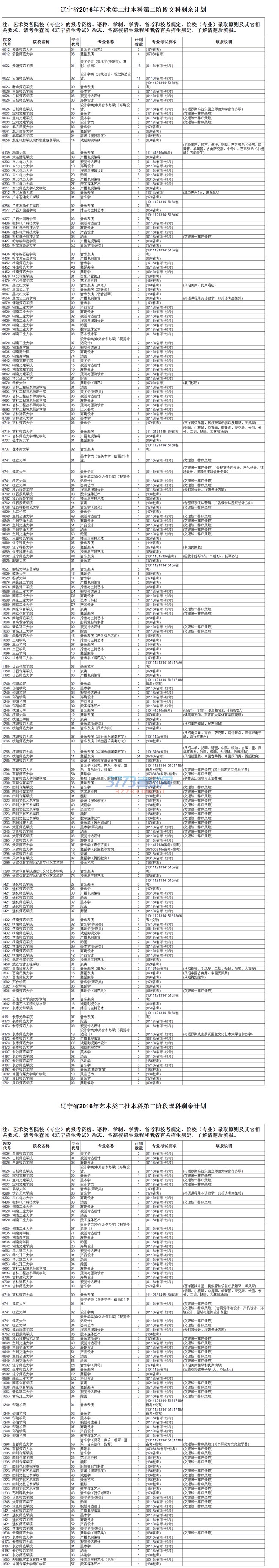 2016年辽宁省普通高校招生艺术类本科二批第二阶段录取院校剩余计划统计表(点击放大查看)