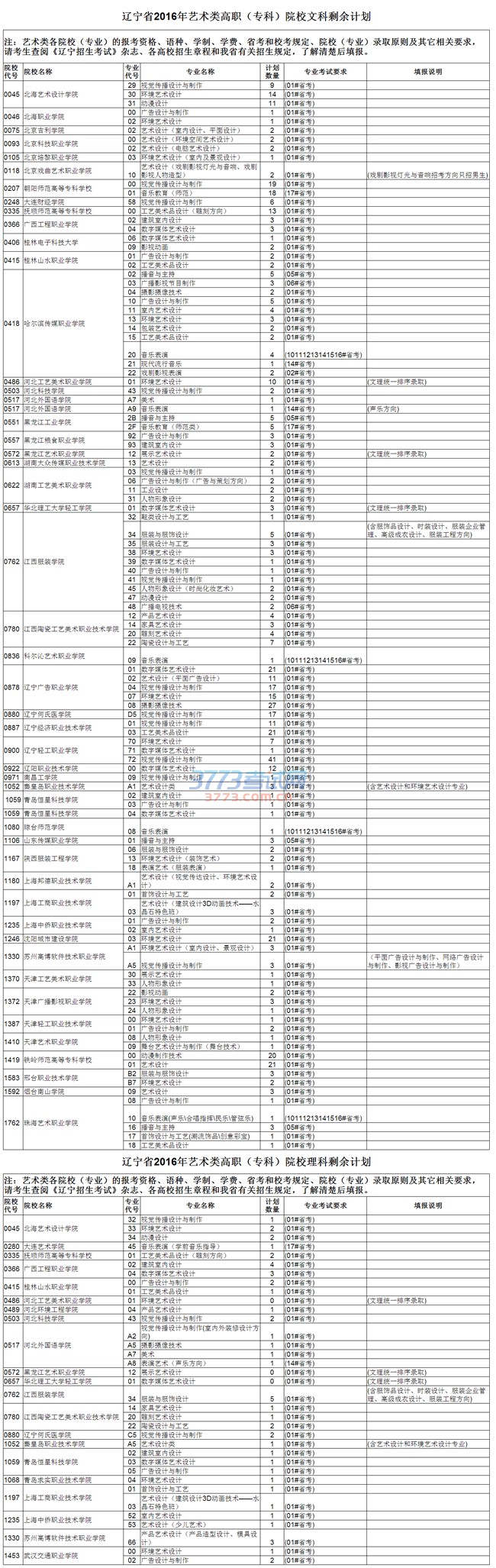 2016年辽宁省普通高校招生艺术类高职(专科)批录取院校剩余计划