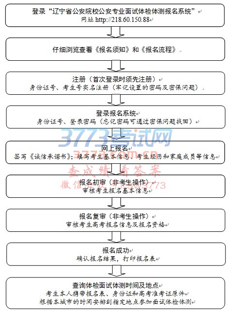 注意:以上五种方式任选一种进行网上报名。“辽宁省公安院校公安专业面试体检体测报名系统”要求Windows 7 以上版本操作系统,使用IE8、360、google等浏览器访问。 (一)考生注册 1.考生必须以本人真实身份证号、考生号实名注册,否则报名无效。一个身份证号、考生号只能注册一个用户。 2.注册时必须提供本人或父母真实可用的手机号码,并保证该号码手机通迅畅通。因手机通迅不畅导致报名不成功等后果,由考生本人承担。 3.请牢记您设置的密码。如忘记密码,可在登录界面点击“忘记密码”,打开“找回密码”功能,通过“身份验证”,重新设置登录密码。 (二)考生登录 使用身份证号及注册密码登录系统。 (三)签写《诚信承诺书》 浏览网上报名须知后,网上签写《诚信承诺书》。考生务必认真阅读、逐项核实确认《诚信承诺书》内容,如实做出承诺。承诺不实的,直接认定为政治考察不合格,考生本人将承担被取消报名资格、入学资格及入学后退学等一切后果。考生因身体健康状况不良等自身原因,导致体能测评中出现受伤、致病、死亡等一切后果,由考生本人承担。签订承诺书时,具体标准请参照《公务员录用体检通用标准(试行)》(人社部发〔2016〕140号)、《公务员录用体检特殊标准(试行)》(人社部发〔2010〕82号)。 (四)考生报名 按照网上报名提示,依次按规定准确填报各项信息。信息主要包括考生基本信息、考生经历信息、家庭成员及主要社会关系信息等内容。考生务必保证填报信息的全面、真实、准确,因信息瞒报、错报、漏报等导致审核不通过、被取消报名资格、取消录取资格、入学后退学等一切后果,由考生本人承担。 (五)报名结果查询 网上报名时限内,系统管理员对考生网上报名信息进行初审;网上报名时限截止后,将考生网上报名信息与考生高考报名信息进行比对复审,复审通过即为报名成功。 考生在5月28日后,登录网上报名系统查询报名审核结果。 (六)参加面试体检体测 网上报名成功的考生,自行打印报名表(A4纸)并签字确认。考生需携带此报名表和身份证、高考准考证原件,于6月中旬参加由公安机关组织的面试体检体测。 面试体检体测具体时间安排,请随时关注网上报名系统“现场面试体检体测时间查询”。 五、服务热线 报名期间咨询电话:0412--5216020;0412--5214490。 咨询时间:5月16日至5月25日 每日 8:30----21:00。 附件:2018年辽宁省公安院校公安专业面试体检体测网上报名流程。 辽宁省公安厅政治部 2018年5月10日 附件:2018年辽宁省公安院校公安专业面试体检体测网上报名流程