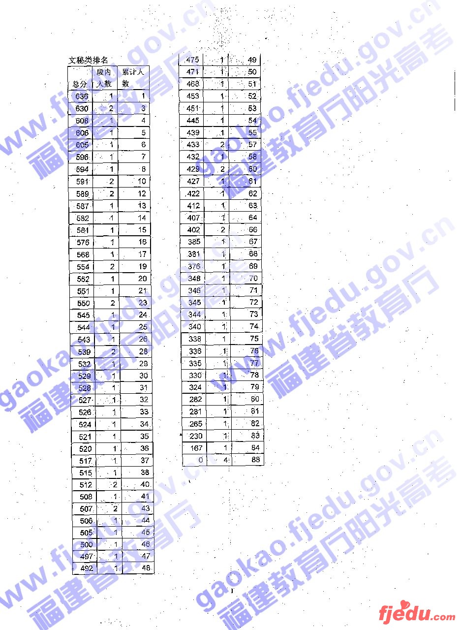 福建省2008年高职单招文秘类分数成绩分布(来源福建教育厅)