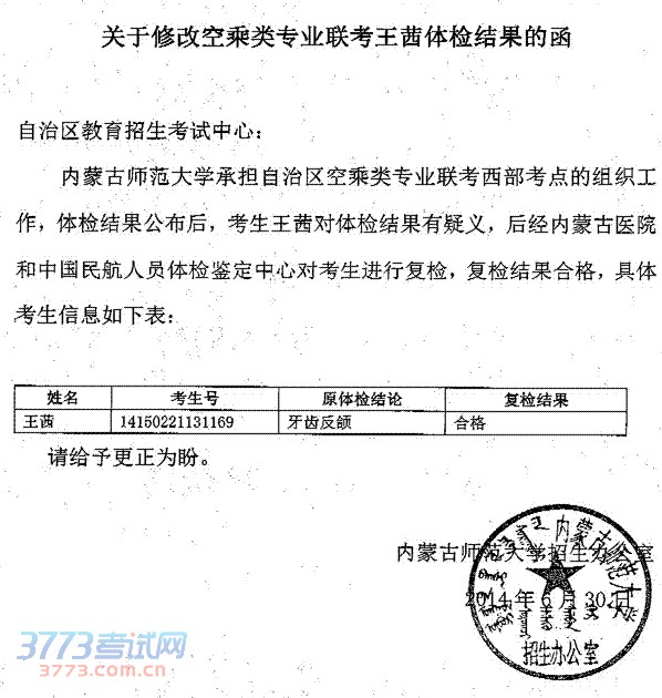 2014内蒙古修改空乘类专业联考王茜体检结果的函