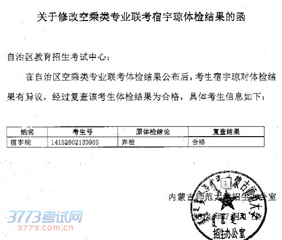 关于修改空乘类专业联考宿宇琼体检结果的函