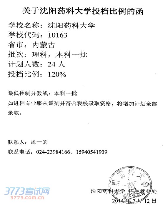 沈阳药科大学2014内蒙古投档比例修改的说明