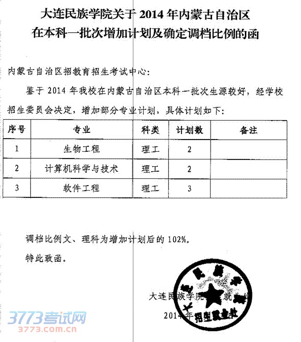 2014内蒙古高考大连民族大学增加计划的通知