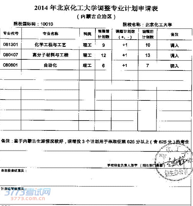 2014内蒙古高考北京化工大学调整专业计划的通知