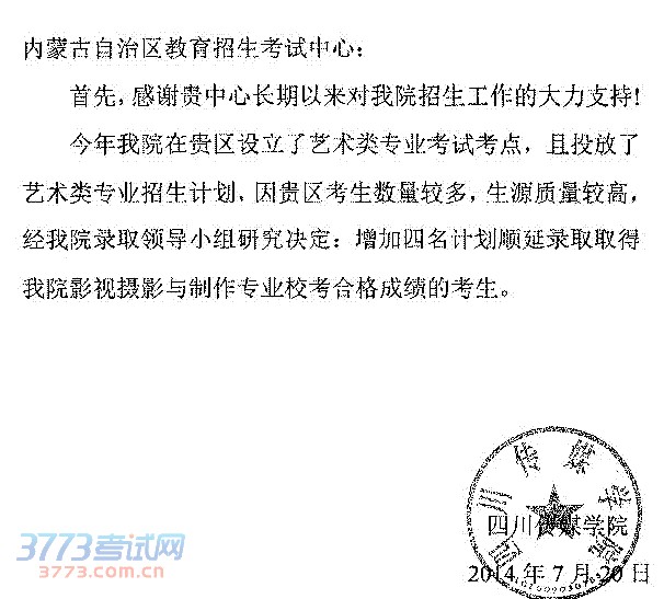 2014内蒙古本科提前B四川传媒学院增加计划的通知