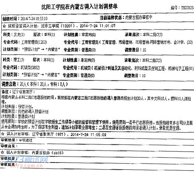 2014内蒙古二本C沈阳工学院增加计划的通知