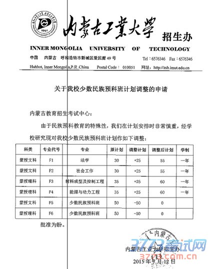 内蒙古工业大学关于调整少数民族预科班计划的通知