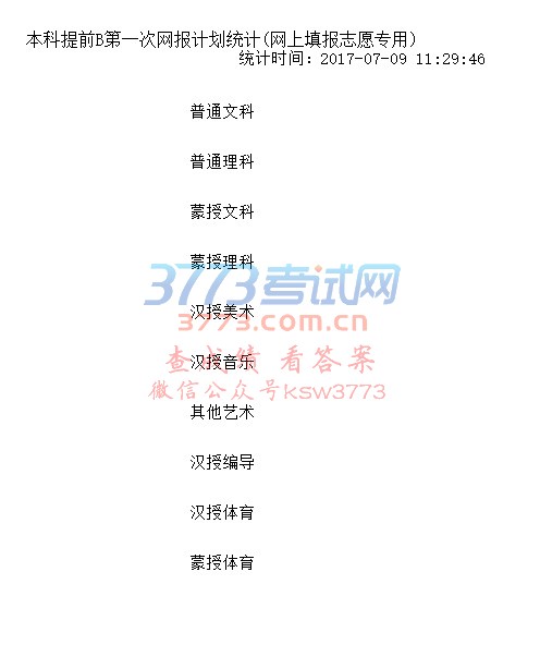 本科提前B第一次网报计划统计(网上填报志愿专用) 统计时间:2017-07-09 11:29:46 A 普通文科 B 普通理科 C 蒙授文科 D 蒙授理科 E 汉授美术 G 汉授音乐 I 其他艺术 @ 汉授编导 K 汉授体育 L 蒙授体育