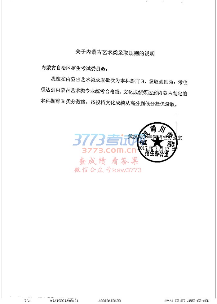 2017武汉晴川学院内蒙古艺术类录取规