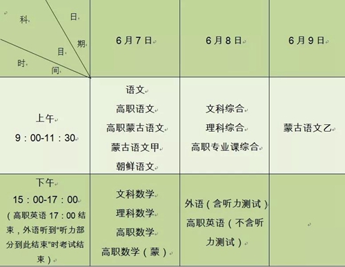 2019内蒙古高考各科目考试时间安排
