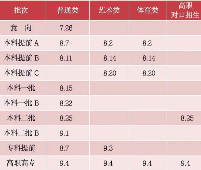 2020年普通高校招生录取科类按普通类、艺术类、体育类、高职对口招生划分。共设置在9个批次中招生,分别为本科提前A批、本科提前B批、本科提前C批、专科提前批、本科一批、本科一批B、本科二批、本科二批B、高职高专批。