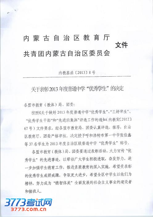 关于表彰2013年内蒙古普通中学优秀学生的决定