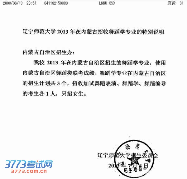 辽宁师范大学2013年在内蒙古招收舞蹈学专业的特别说明