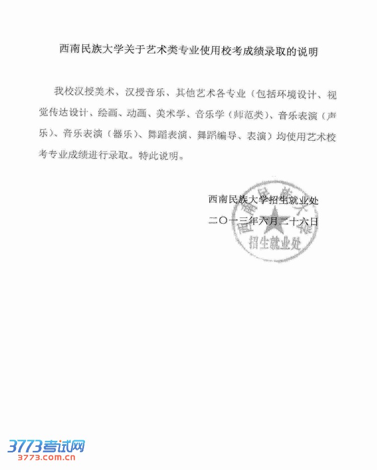 西南民族大学艺术类专业使用校考成绩录取的说明
