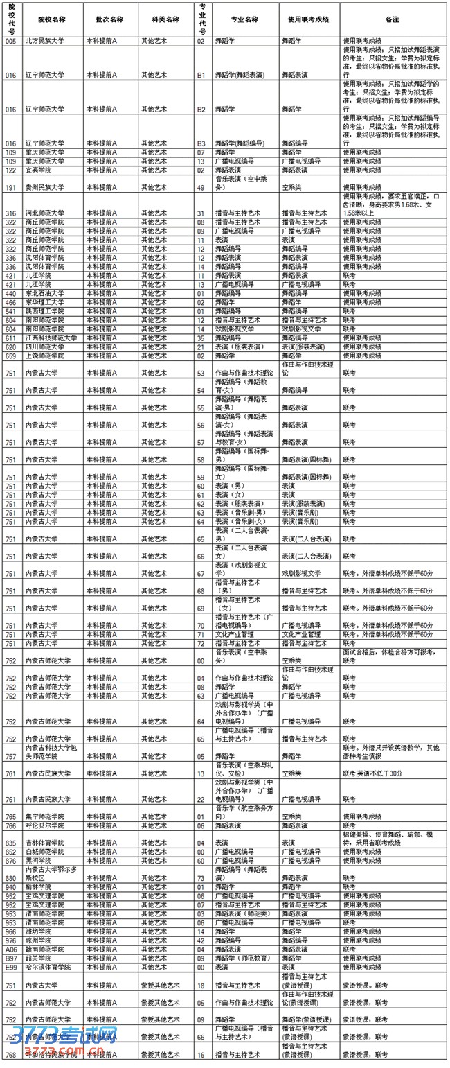 2013年内蒙古普通高校招生本科提前A批其他艺术类各校各专业对应的联考成绩