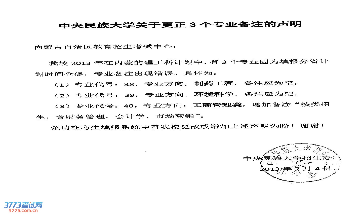 中央民族大学2013内蒙古更正3个专业备注的声明