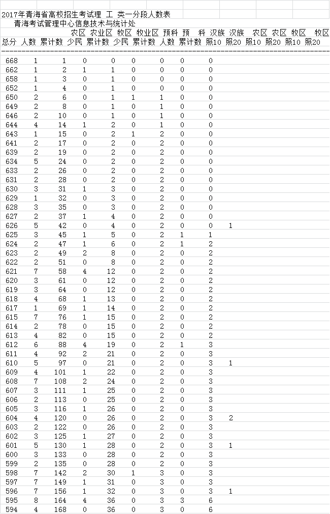 目前,2017年青海高考成绩理工类一分一段表已经公布,详细如下:
