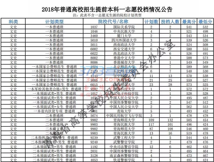 2018青海高考招生提前本科一志愿投档情况