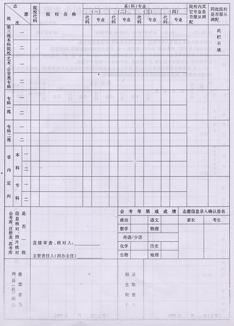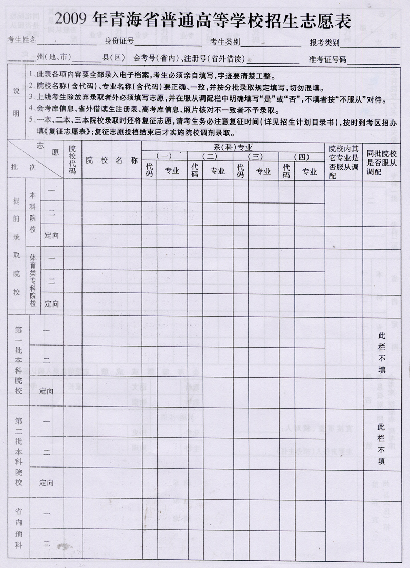 2009年青海省普通高考招生志愿表样表