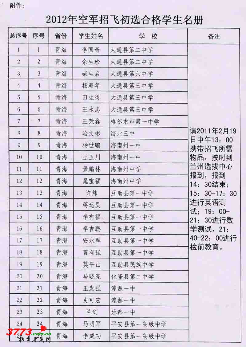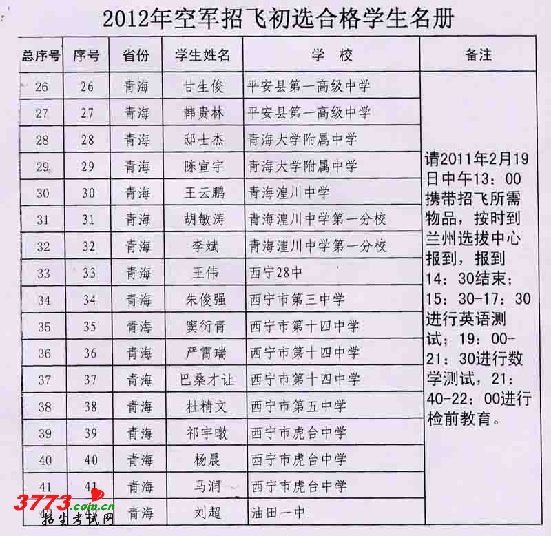 2012年青海省空军招飞初选工作11月1日