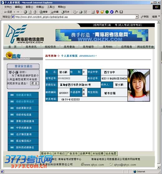 个人电子档案 显示考生的基本状况。内容包括:姓名、性别、毕业学校、准考证号、身份证号、联系地址、邮编、外语语种、联系电话等。