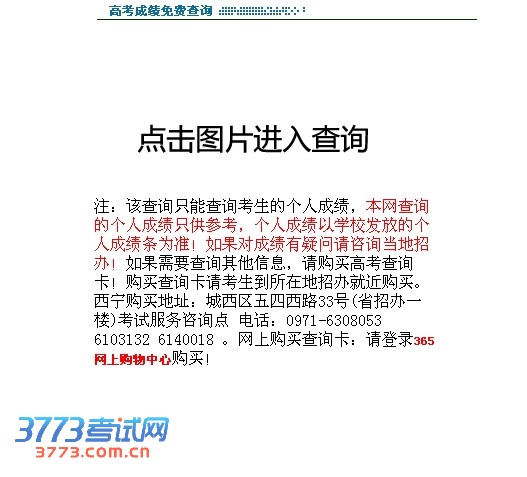 注:该查询只能查询考生的个人成绩,本网查询的个人成绩只供参考,个人成绩以学校发放的个人成绩条为准!如果对成绩有疑问请咨询当地招办!如果需要查询其他信息,请购买高考查询卡!购买查询卡请考生到所在地招办就近购买。西宁购买地址:城西区五四西路33号(省招办一楼)考试服务咨询点 电话:0971-6308053 6103132 6140018 。网上购买查询卡:请登录365网上购物中心购买!