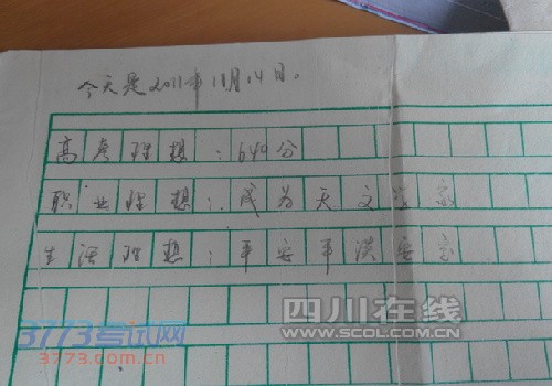 2011年11月14日,14岁的李锦和全班另外49名同学一起,写下了一封“梦想宣言书”,并被封存至今。李锦的“梦想宣言书”上这样写道:高考理想640分,职业理想是成为天文学家,生活理想是平安平淡。三年之后,再次打开这封封面上写着“李锦清华”字样的被封存的信件,李锦用670分的高分实现了第一个理想。
