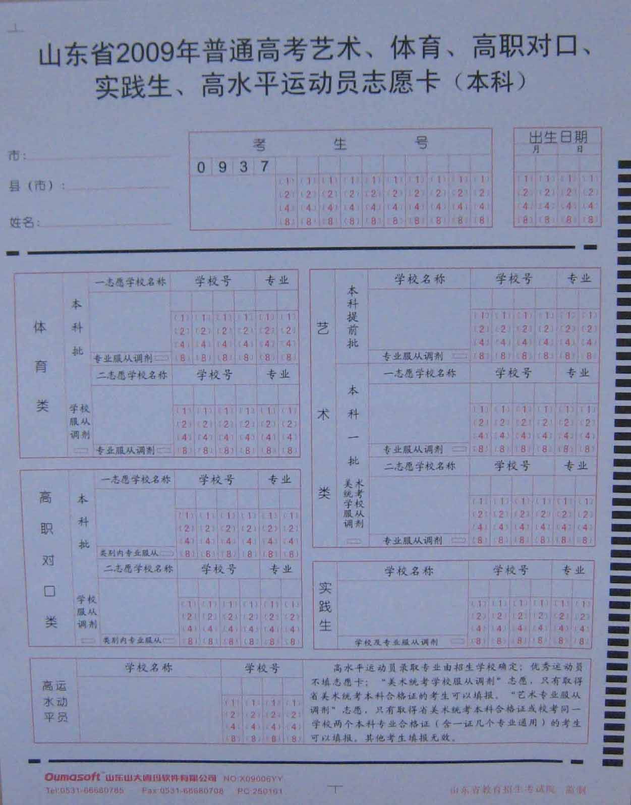 山东省2009高考艺术、体育、高职对口、实践生、高水平运动员志愿卡(本科)