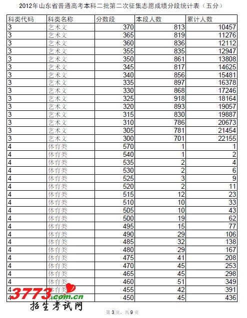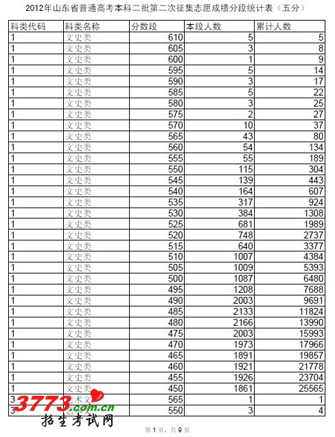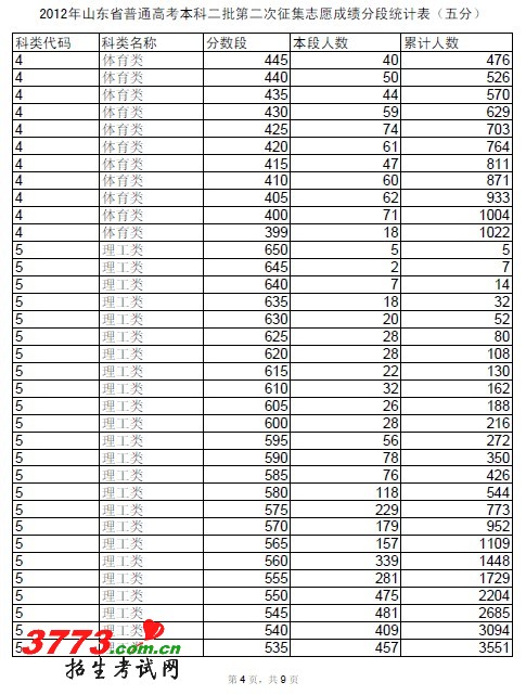 2012年山东高考本科二批第二次征集志愿成绩分段统计表(5分)